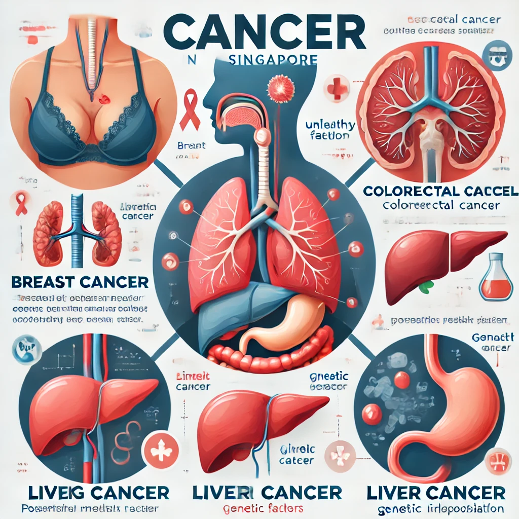 싱가포르에서는 여러 유형의 암이 발생하며, 특히 **유방암, 대장암, 폐암, 간암, 위암**이 높은 발병률을 보입니다. 싱가포르 국립암센터(NCCS)에서 발표한 자료에 따르면, 최근 10년간 암 발생률이 꾸준히 증가하고 있으며, 생활 습관과 환경적 요인이 중요한 영향을 미치는 것으로 분석되었습니다.