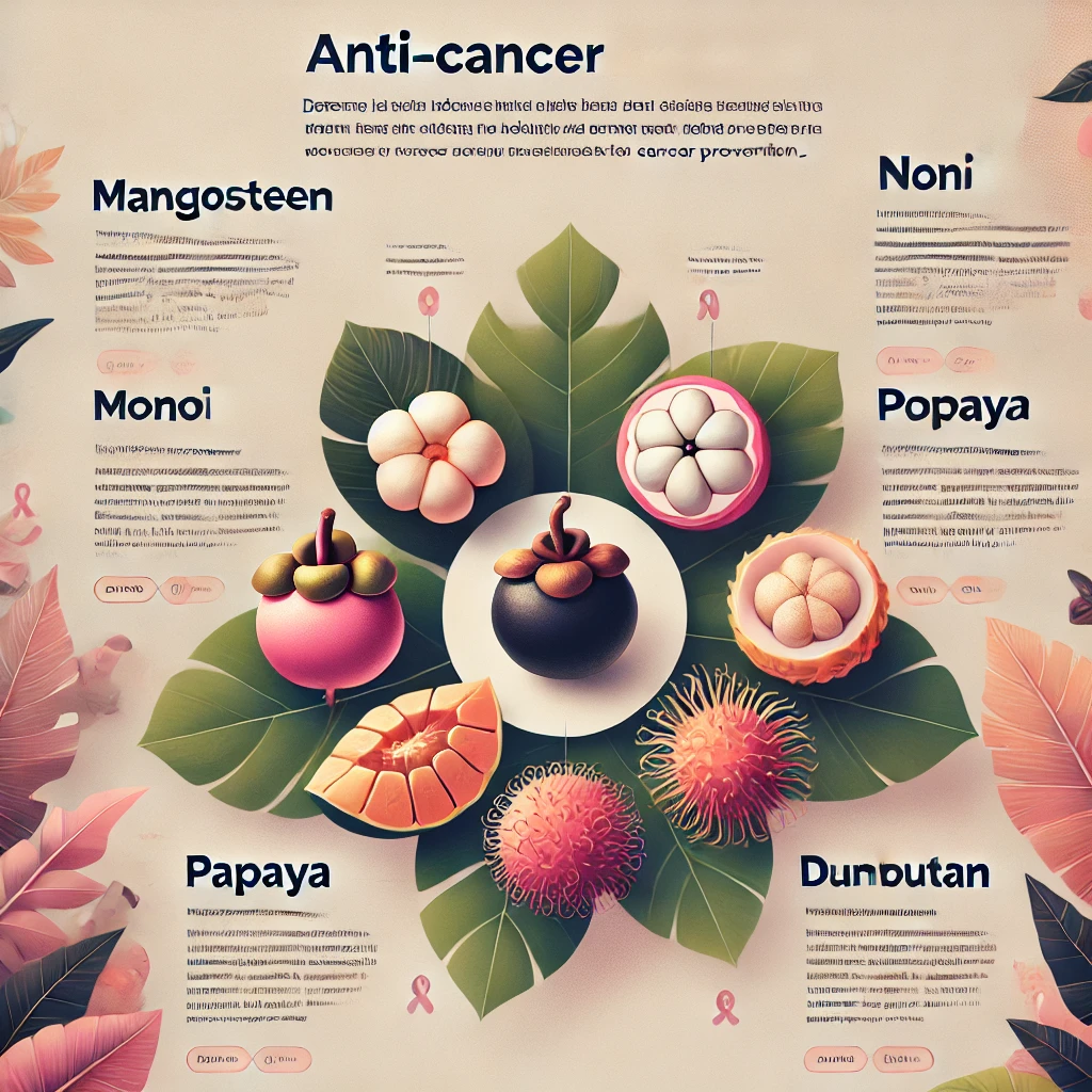 인도네시아에서 자라는 대표적인 항암 과일로는 망고스틴, 노니, 파파야, 두쿠, 람부탄 등이 있습니다. 이 과일들은 전통적으로 자연 의학에서 활용되어 왔으며, 최근 과학 연구에서도 항암 효과가 입증되고 있습니다.